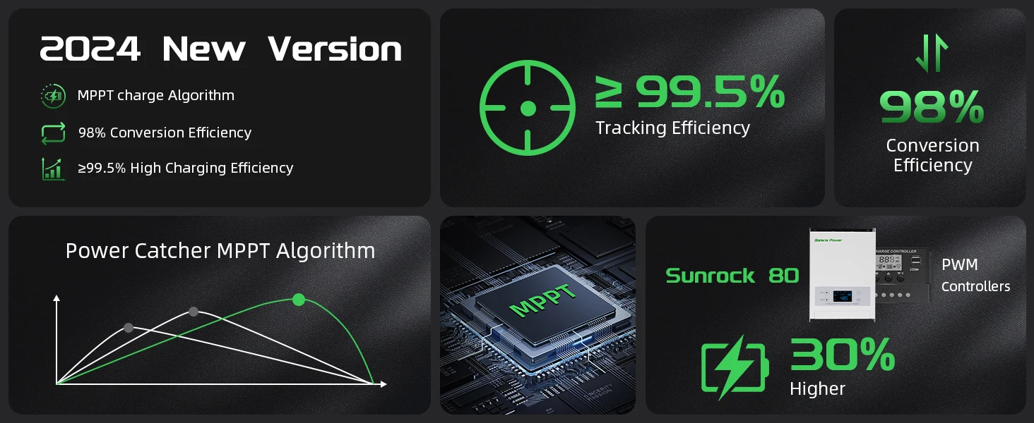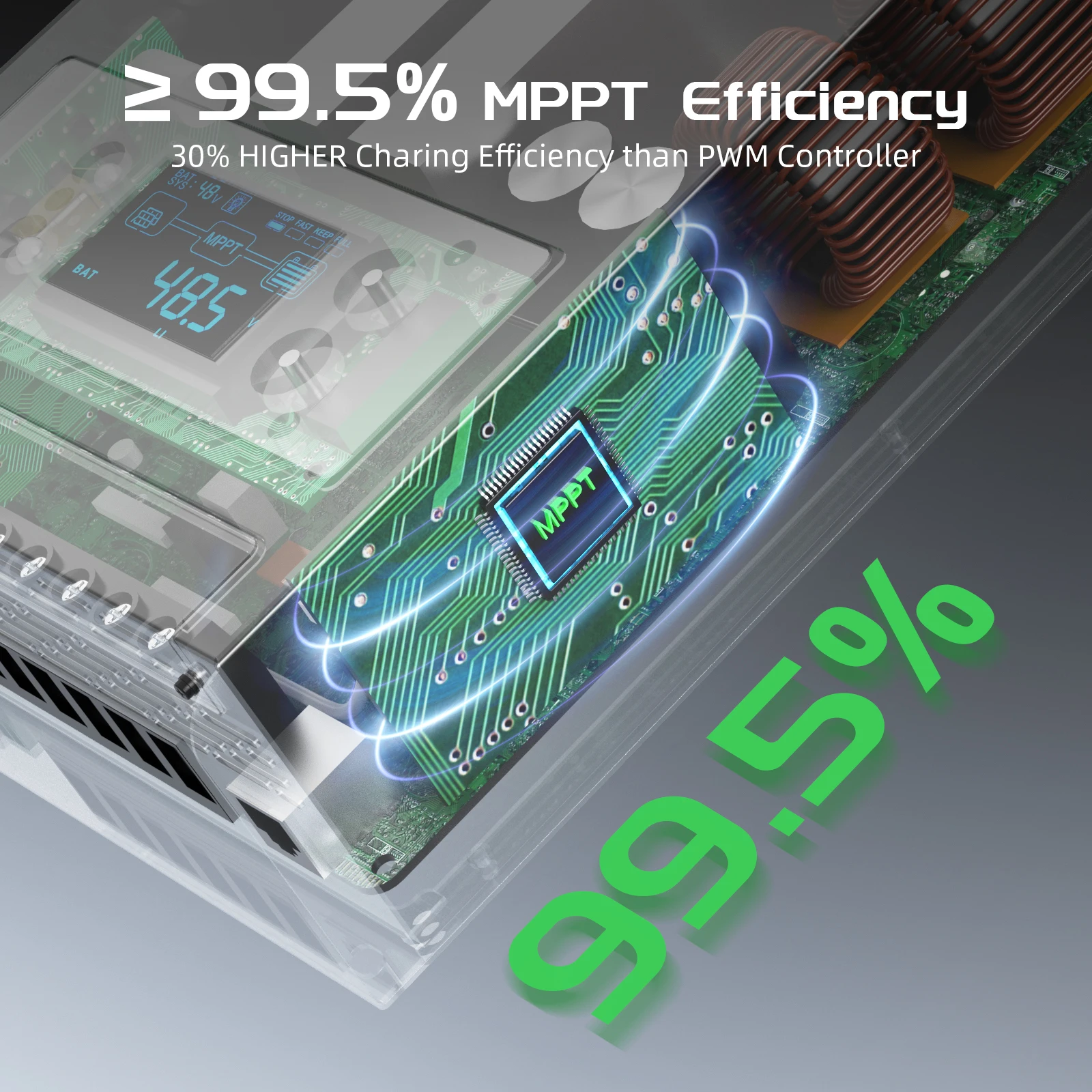 【99.5% Tracking Technology】: The innovative Max Power Point Technology allows to deliver high tracking efficiency of up to 99.5% and peak conversion efficiency of 98%, improve approximately 20%-35% utilization rate of solar panel system than regular PWM controller.