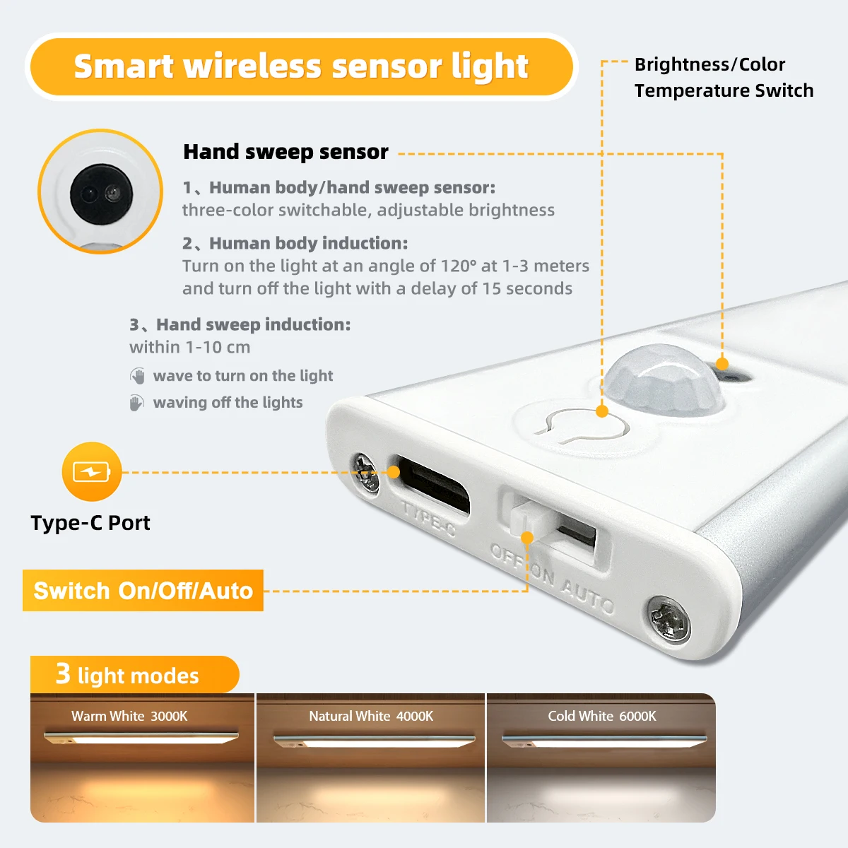 This under cabinet light offers 3 modes: ① AUTO: Night mode – illuminates in dark when human motion is sensed. Light activates within 10ft/120°. No motion for 15s after power-on triggers auto-off for energy saving. Includes unique hand wave activation. Turning off hand-wave mode reverts to auto sensor in 30s. After 3 mins in hand-wave mode, light auto-switches off to enter sensor mode. ② Always-on mode. ③ Always-off mode.