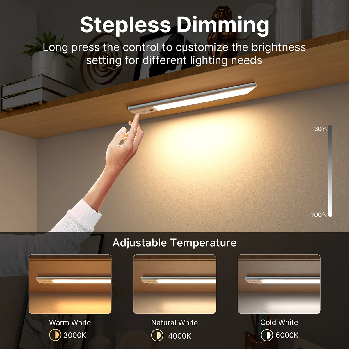Continuously dimming, long press to adjust brightness. One click allows you to select one of the three colors of temperature: 3000K (warm white), 4000K (natural light), and 6000K (cold white), suitable for lighting in different environments.