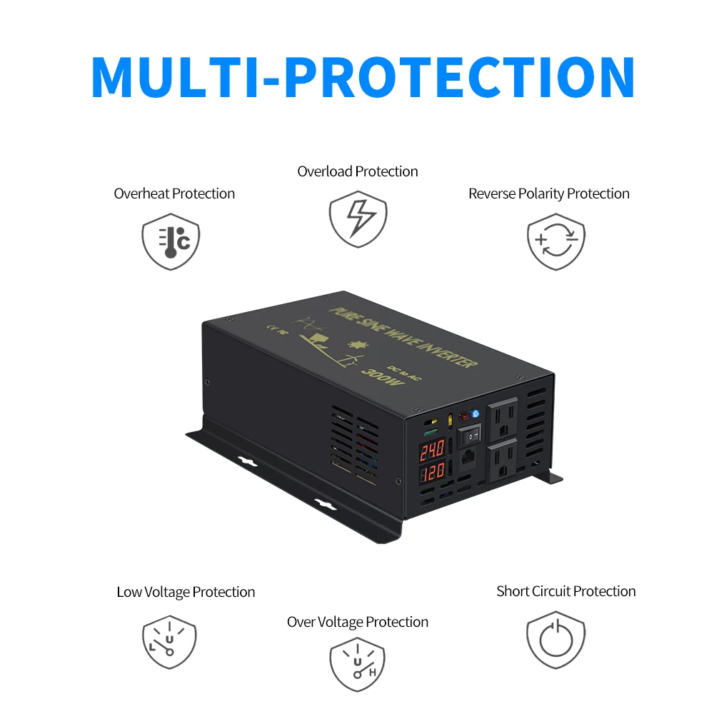 Thermal protection, Overload protection, Over Voltage protection, Under Voltage protection, Low Voltage protection alarm. Inverter comes with an LED light to indicate the problem.