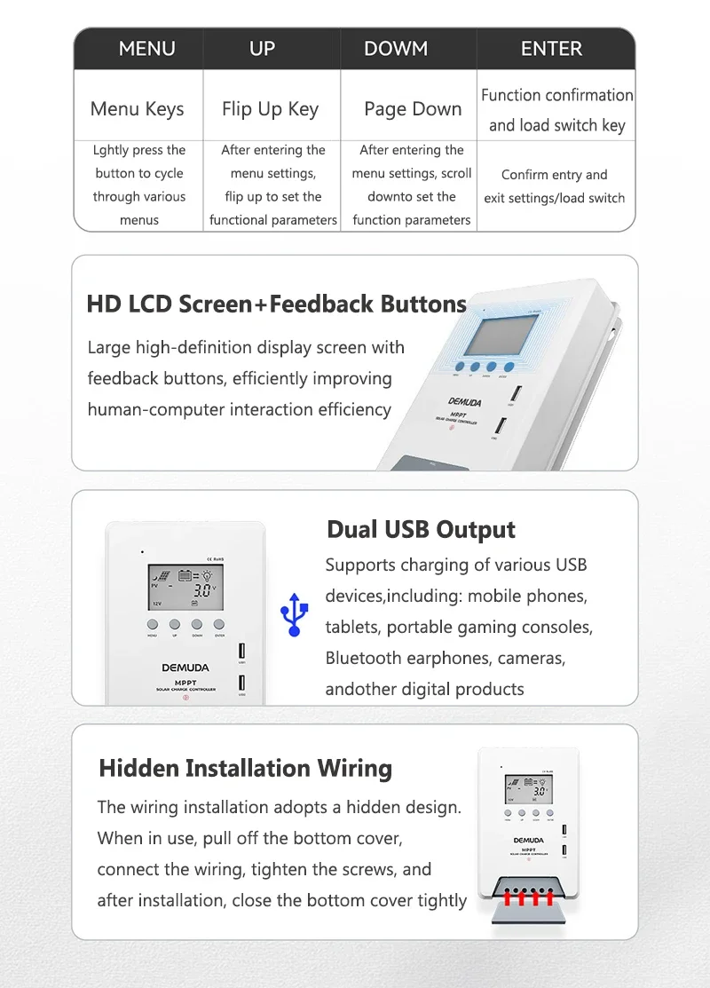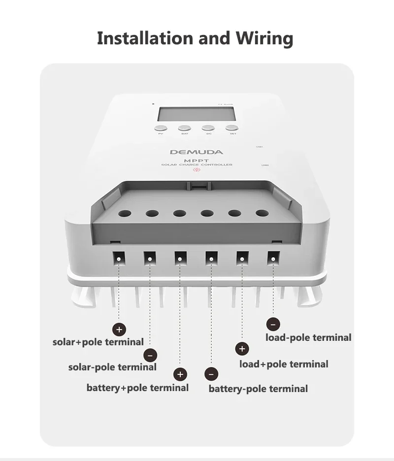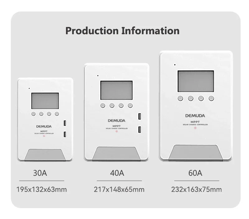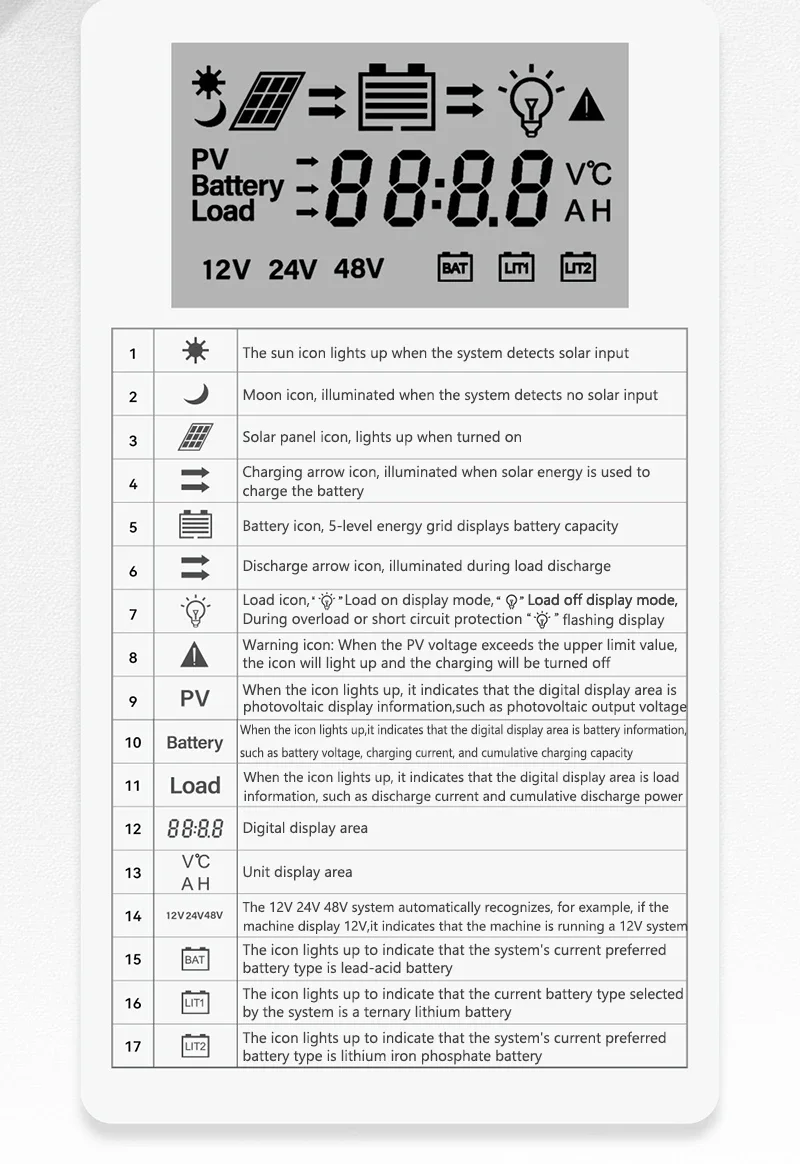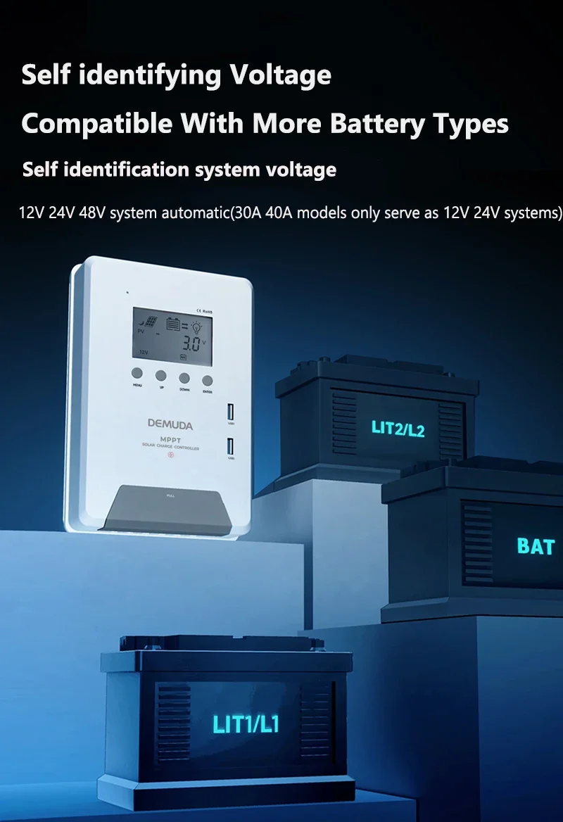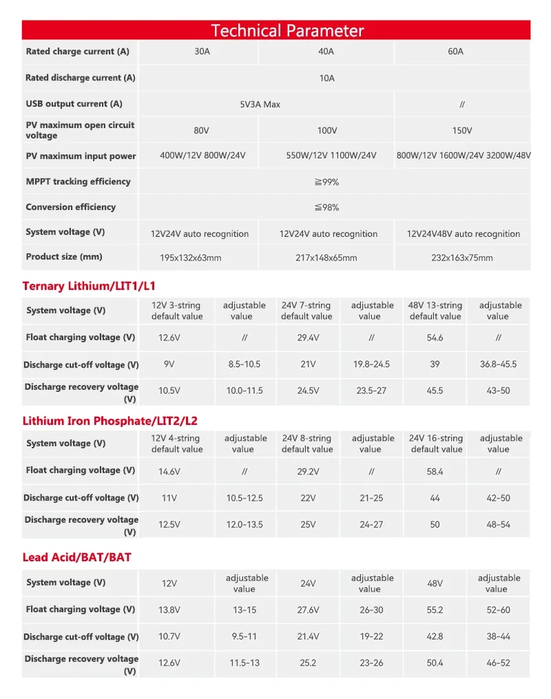 System voltage: 60A=12V/24V/48V automatic identification, 30A/40A=12V/24V automatic identification