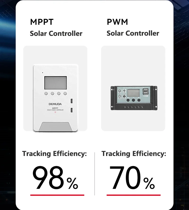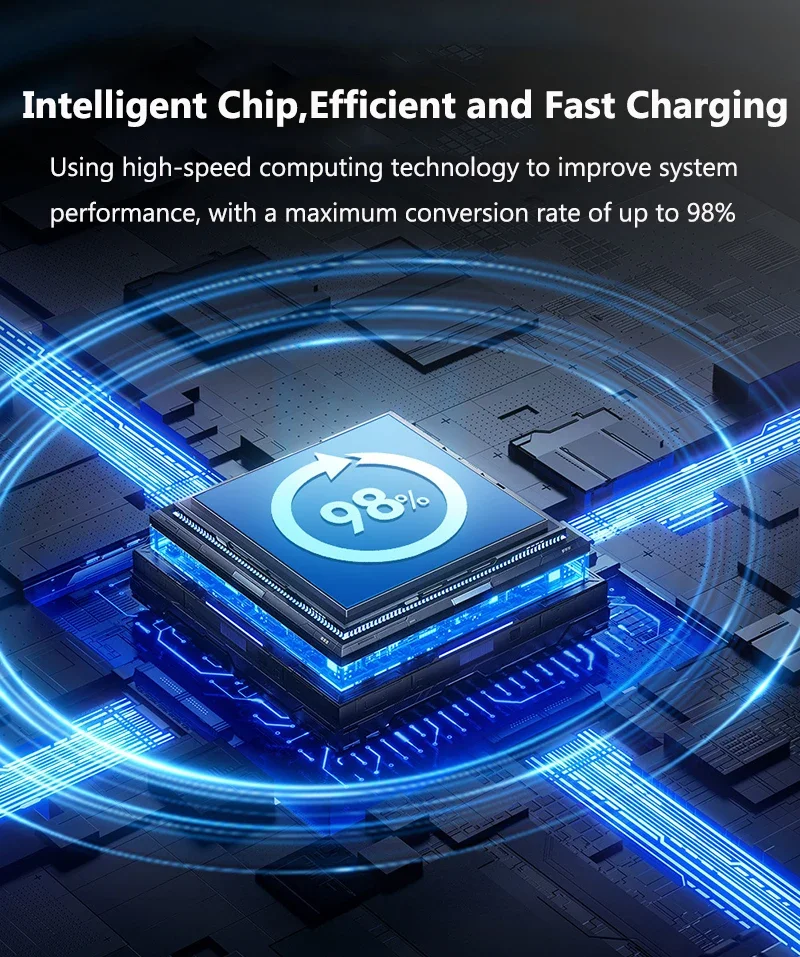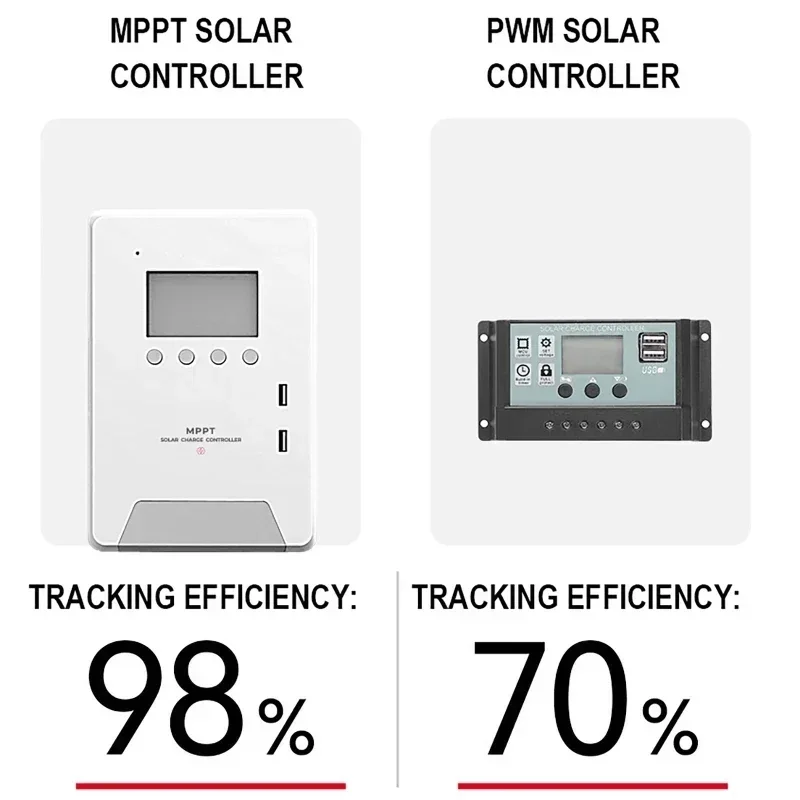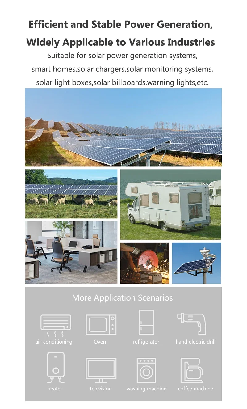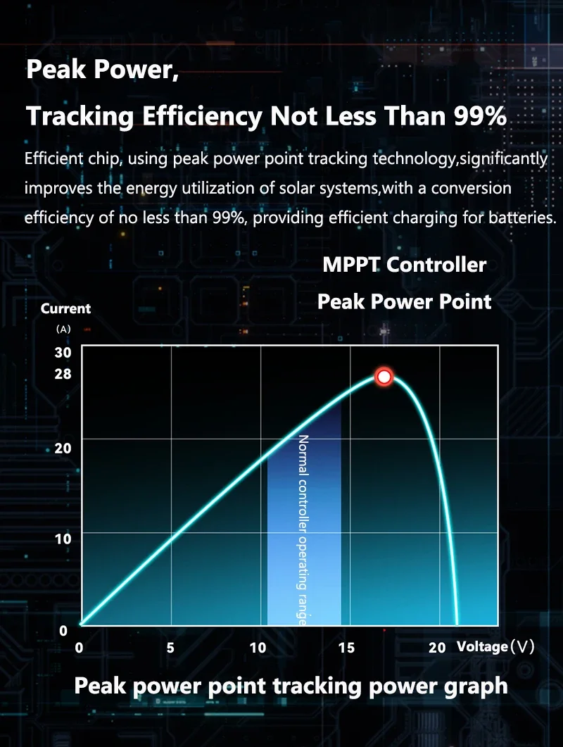 * Peak power tracking efficiency is not less than 99%. High-efficiency chip adopts peak power point tracking technology to greatly improve the energy utilization rate of solar energy system. The conversion efficiency is not less than 99%, which can efficiently charge the battery.