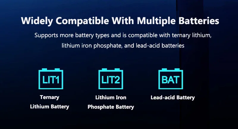 * Widely compatible with a variety of batteries, compatible with ternary lithium batteries, lithium iron phosphate batteries, lead-acid batteries.