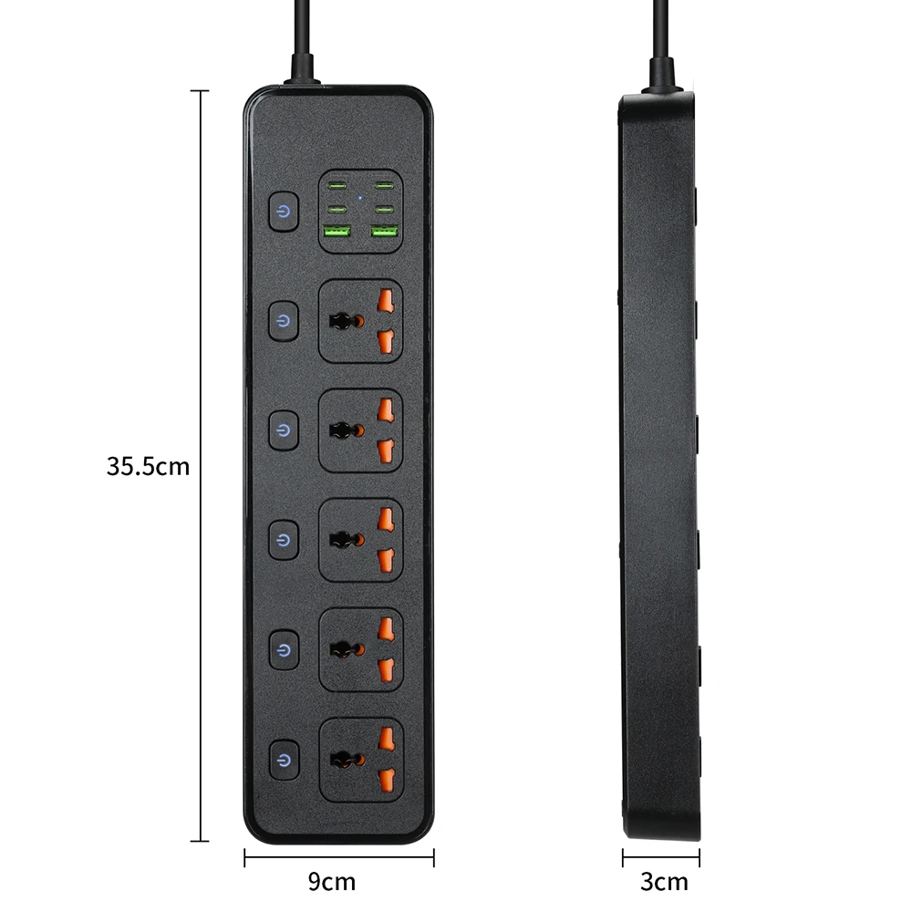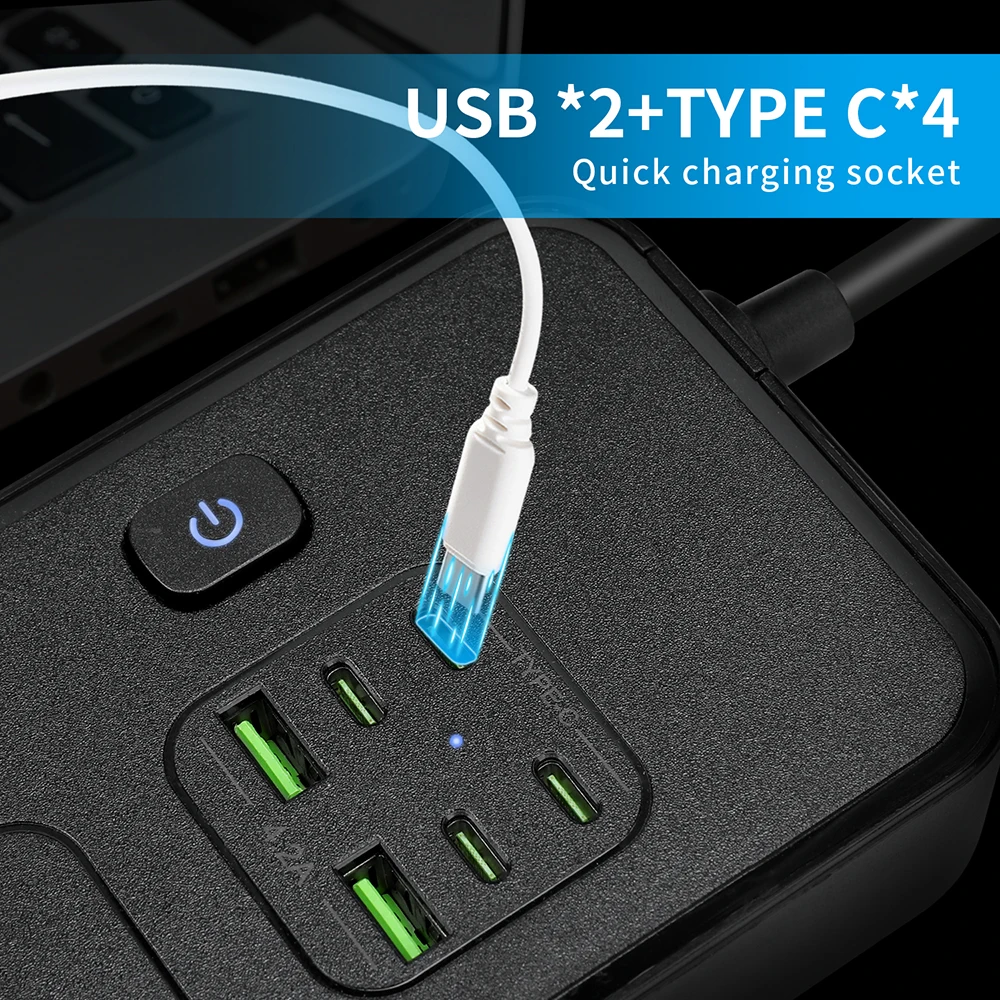 3250W 13A 250V 5 universal socket with 4Type-C and 2USB 2m cable independent switch power strip