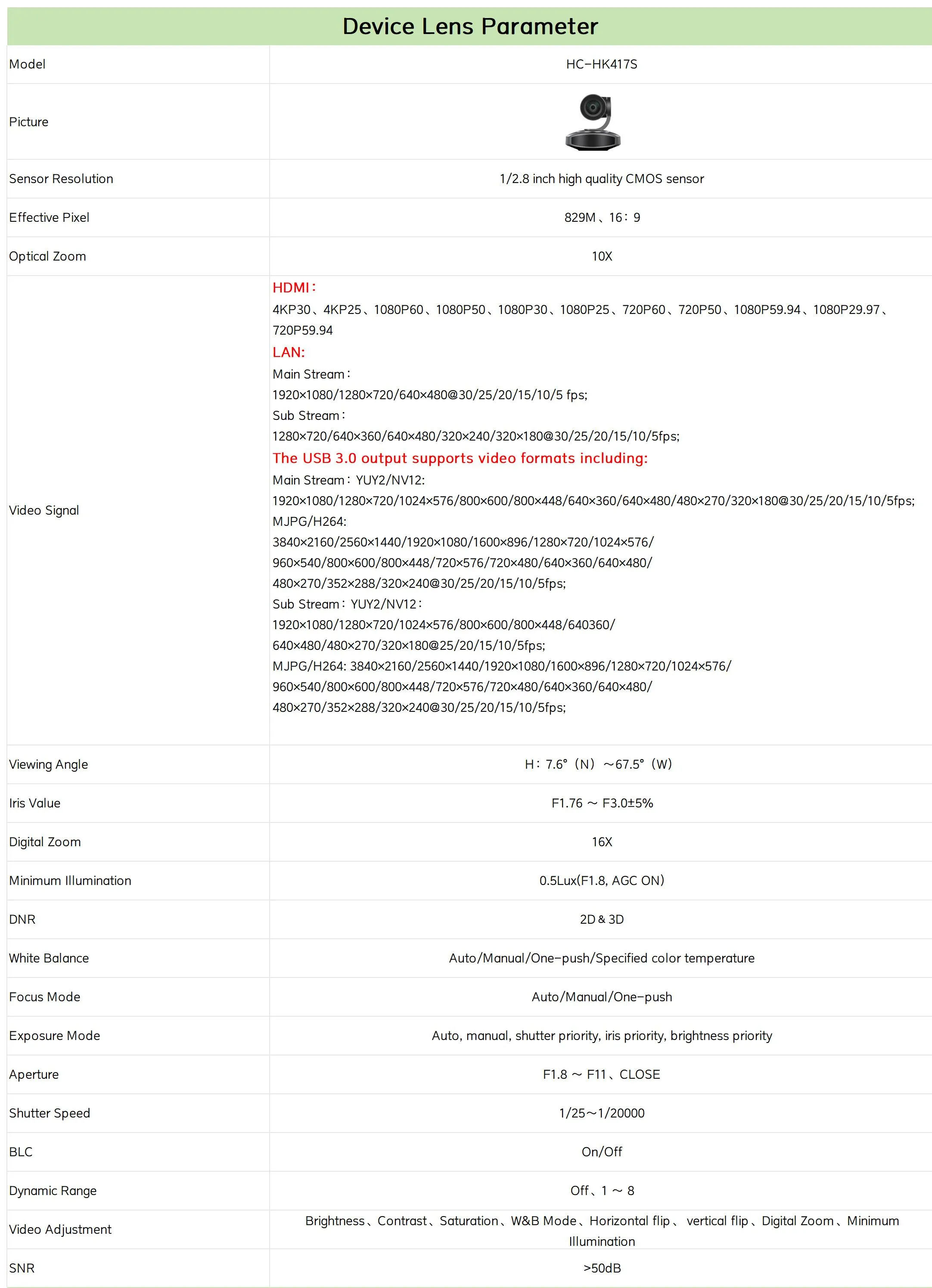 HK417:The Information Communication HD Camera Series features comprehensive functions, excellent performance, and rich interfaces. Advanced ISP processing technology and algorithms ensure vivid and lifelike images, uniform brightness, strong color hierarchy, high clarity, and excellent color reproduction. It supports H.265/H.264/MJPEG encoding, making the picture smoother and clearer even under low bandwidth conditions.