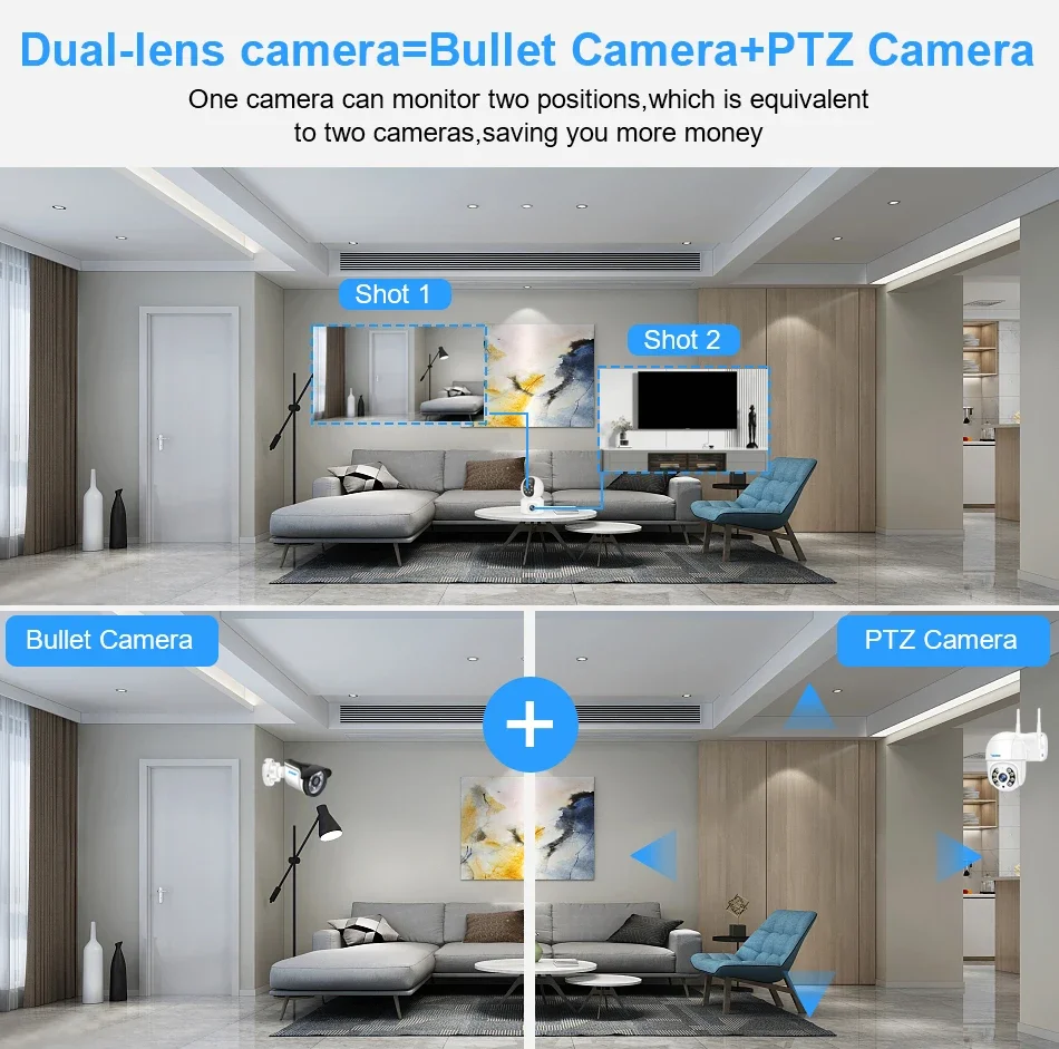 ② Dual Lens && Dual Screen,one lens can be used for fixed monitoring, and the other lens can be used for PTZ monitoring