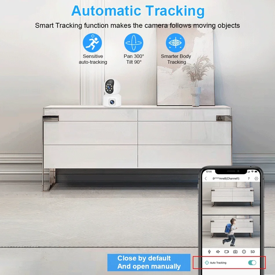 When someone passes through the protected area, the camera will detect the person’s movement and follow the person.