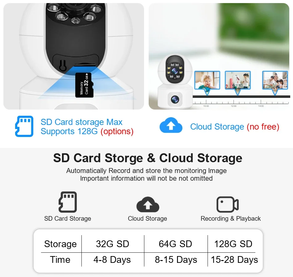 The camera supports up to 128GB TF card local backup, and also provides cloud storage service;