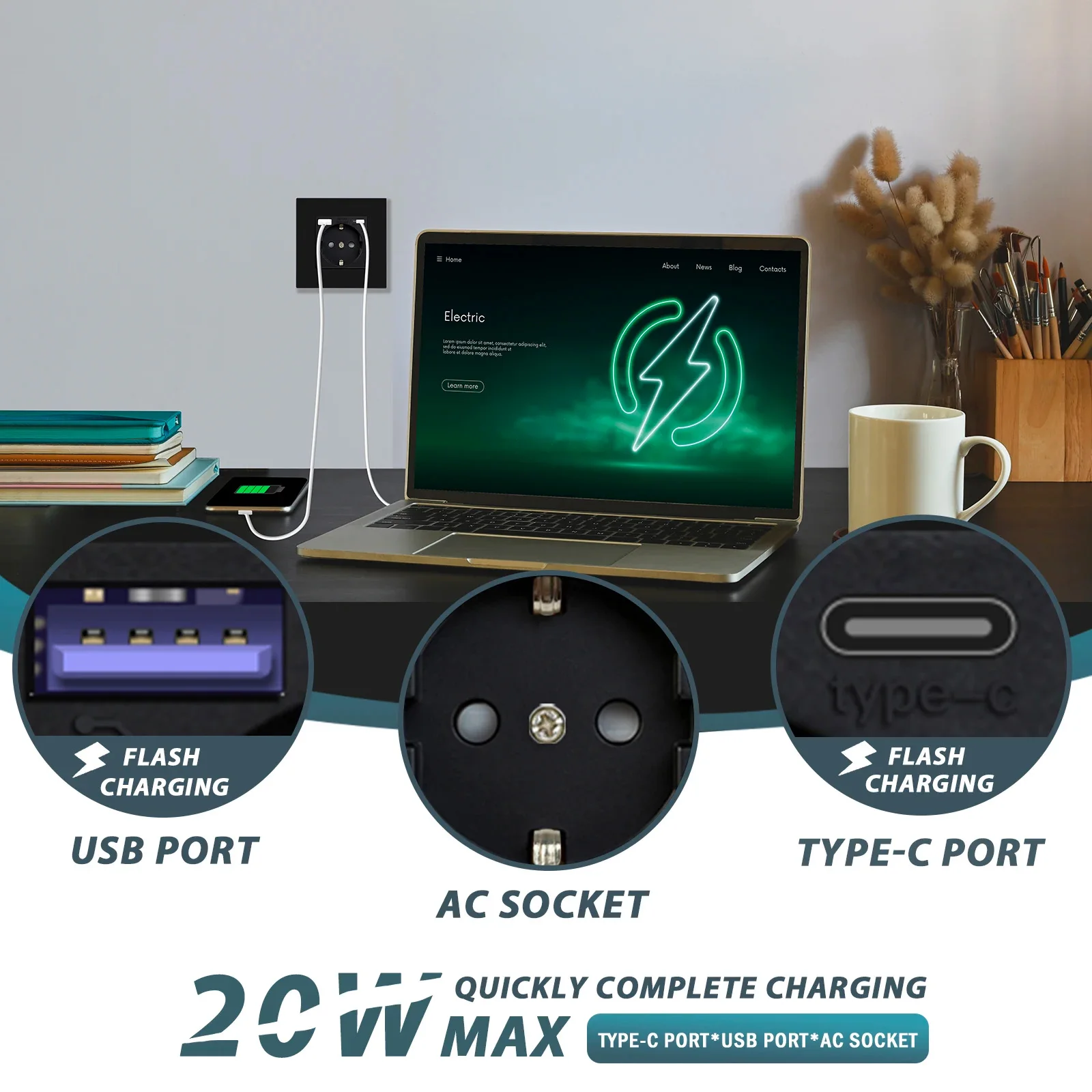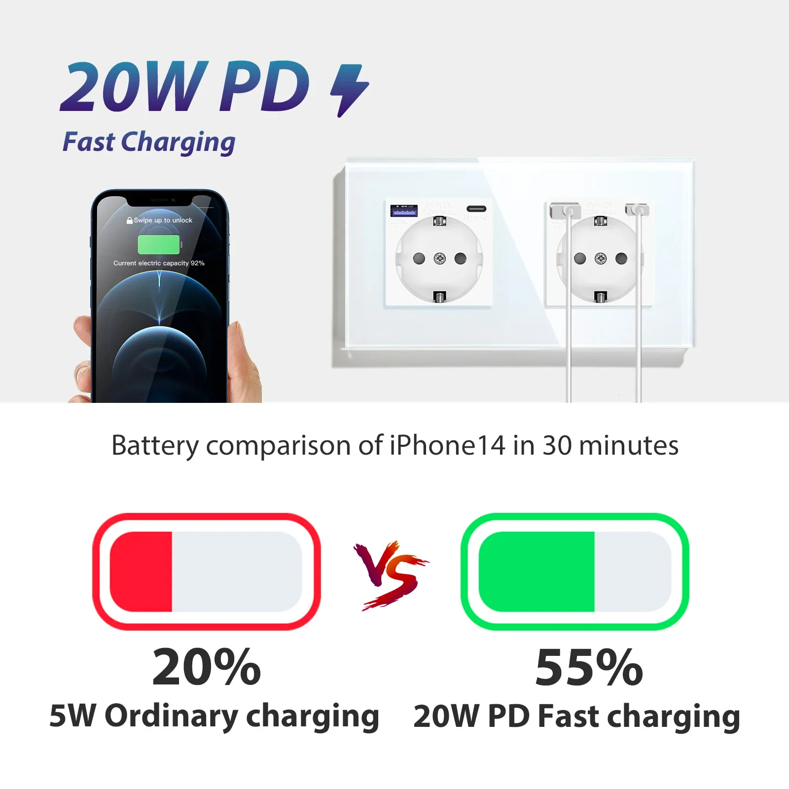 BSEED 20W Fast Charging EU Plug Wall Socket With Type-C USB Electric Socket Outlets Germany Socket NO Glass Panel DIY Part Only