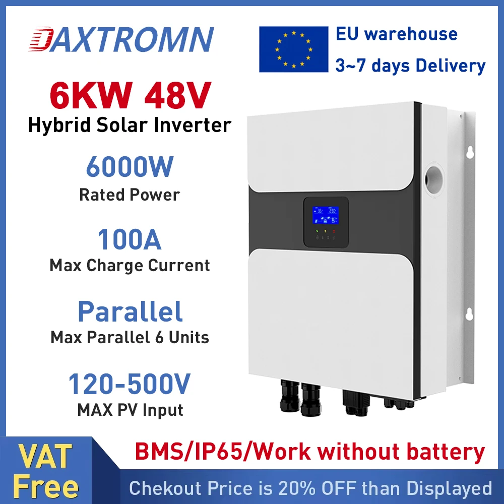 Daxtromn 6000W 6KW Hybrid Solar Inverter 48V 230VAC Pure Sine Wave Inverter Built-in 100A Solar Charger Controller IP65 Parallel