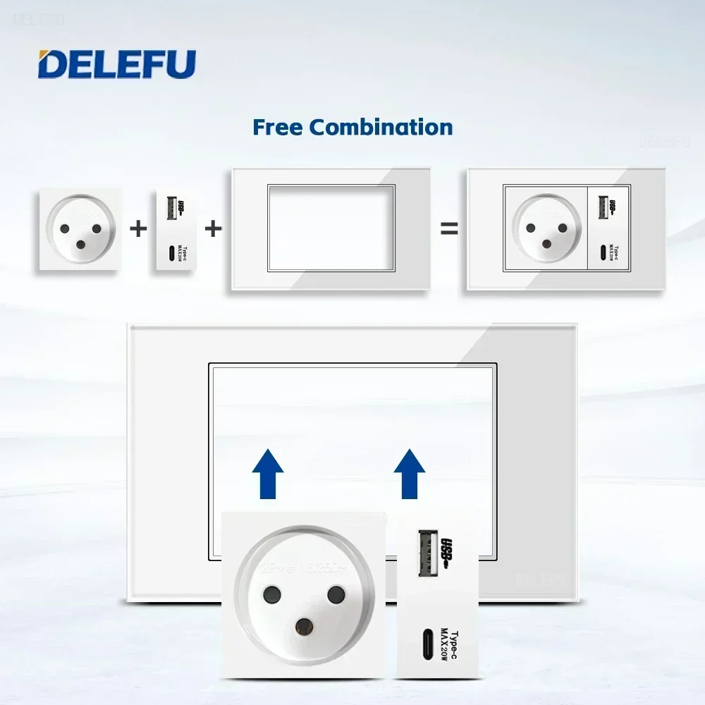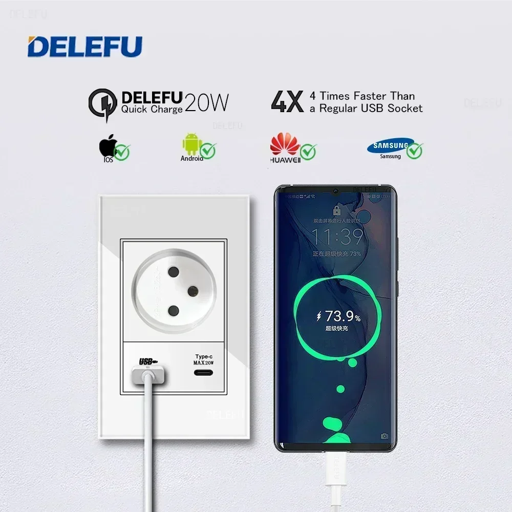 DELEFU White Tempered Glass Israel USB Type C Fast Charging Wall Socket Light Tuya Wifi Smart Switch Sat TV Tel Doorbell Curtain