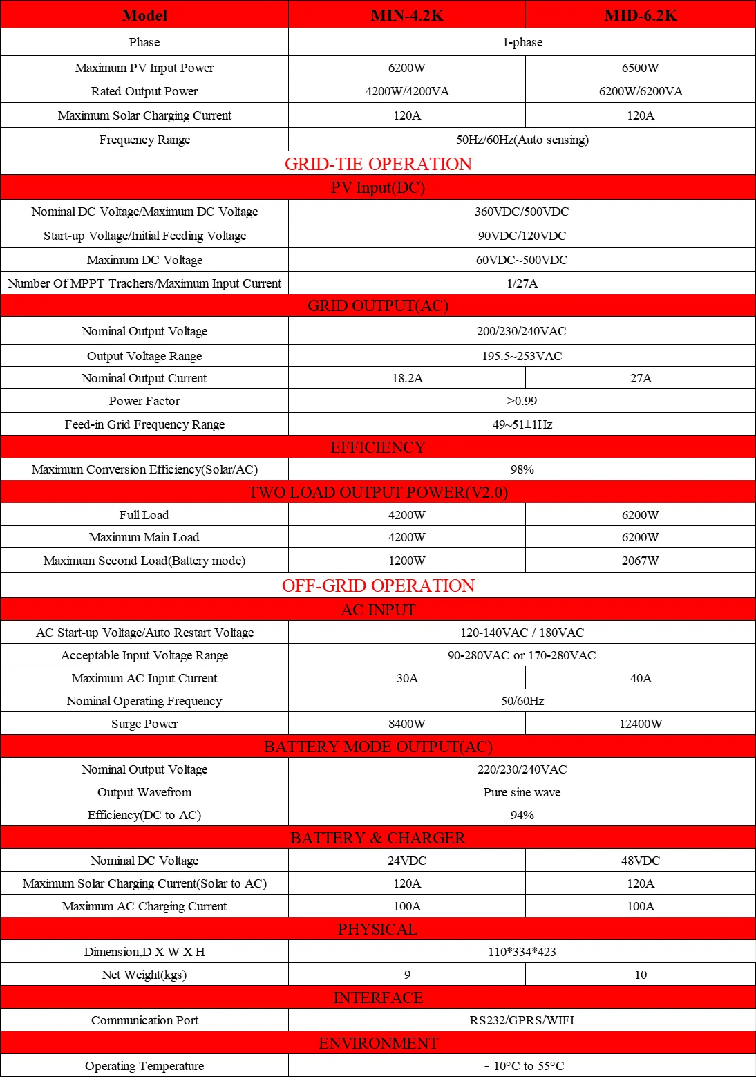 • MPPT:max 6200W(for 4.2KW),max 6500W(for 6.2KW)