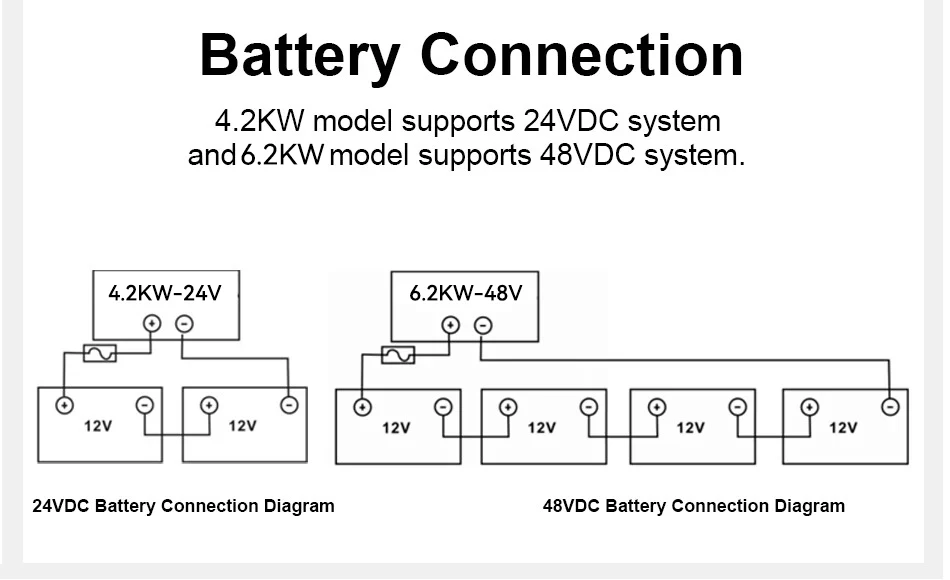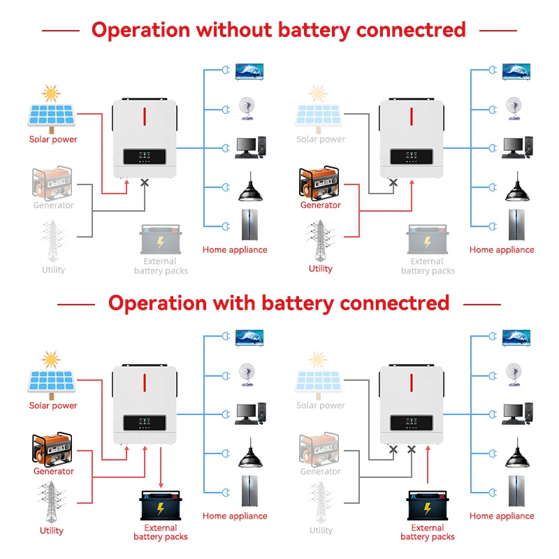 it is an off-grid hybrid inverter that works without batteries. This inverter is a high frequency inverter,Lead-acid batteries, gel batteries, and lithium batteries can be used.