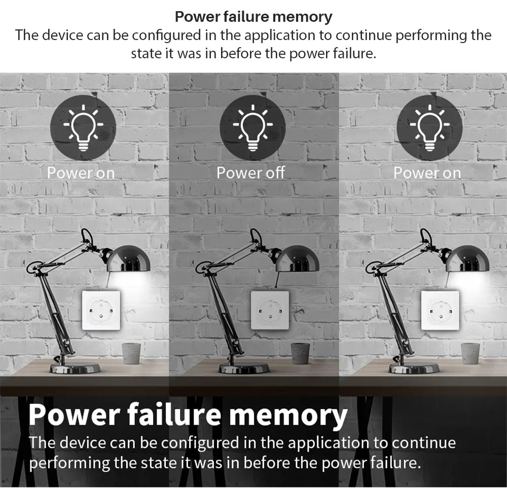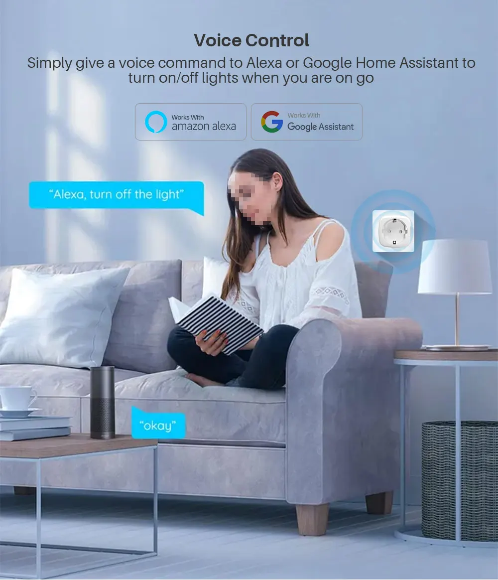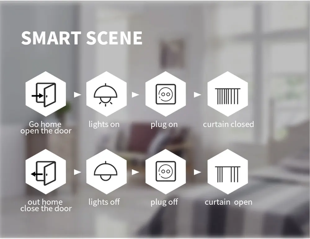 It has a scene setting function. You can choose a suitable scene to run the appliances by start the mode, such as home mode, temperature and humidity or other conditions. For example, if you go home and open the door, you can set the light which connect the power to this smart power plug on and then the camera off.