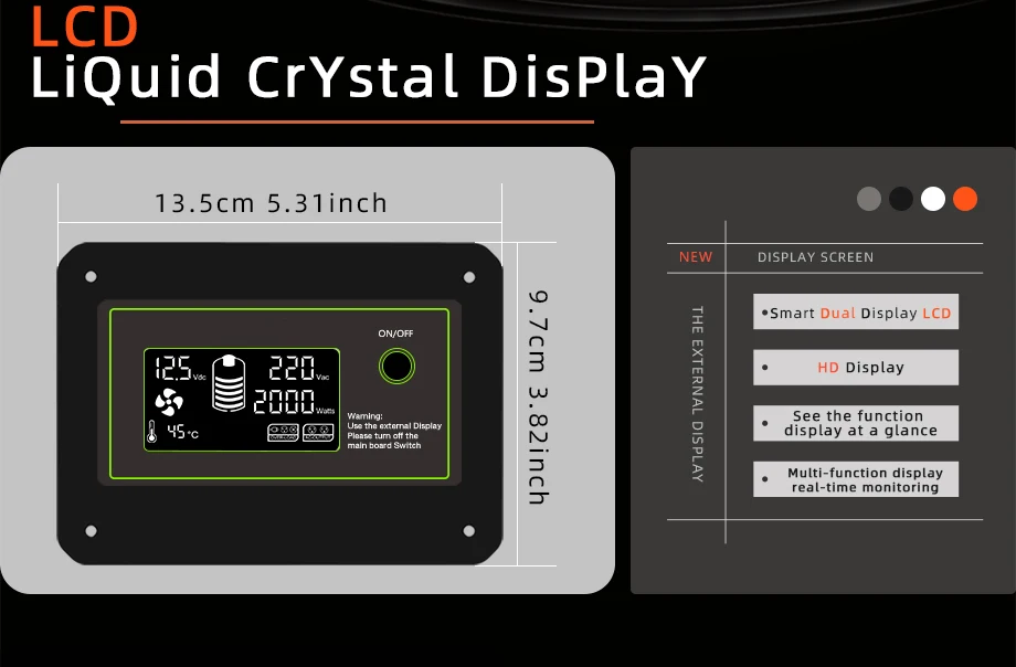 Isolated LCD digital color screen:Battery power % ratio,Battery voltag,AC voltage, AC power, Temperature