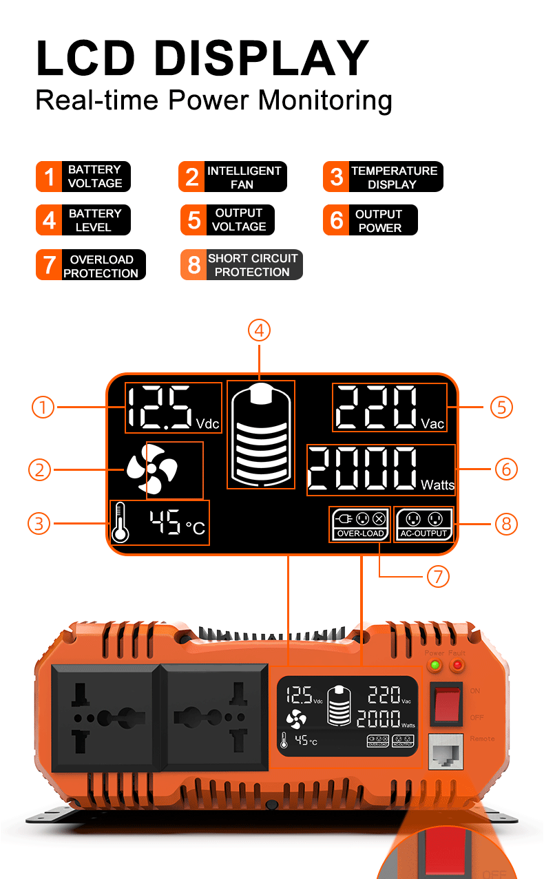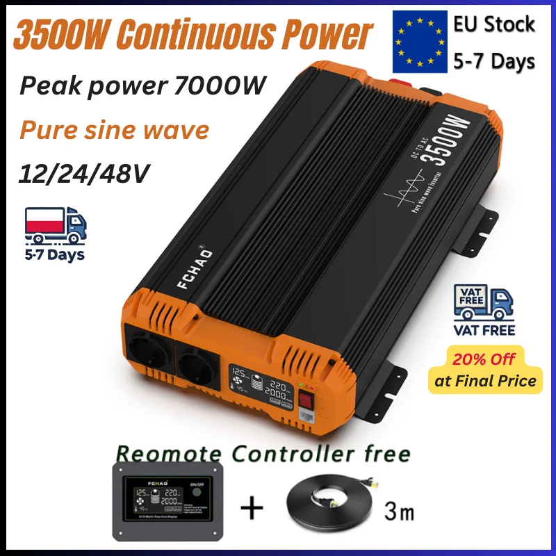 FCHAO 7000W Inverter auto 12v 220V,Pure Sine Wave 3500W Continuous Power, Remote Controller, EU Socket, 50Hz, for Home and RVs