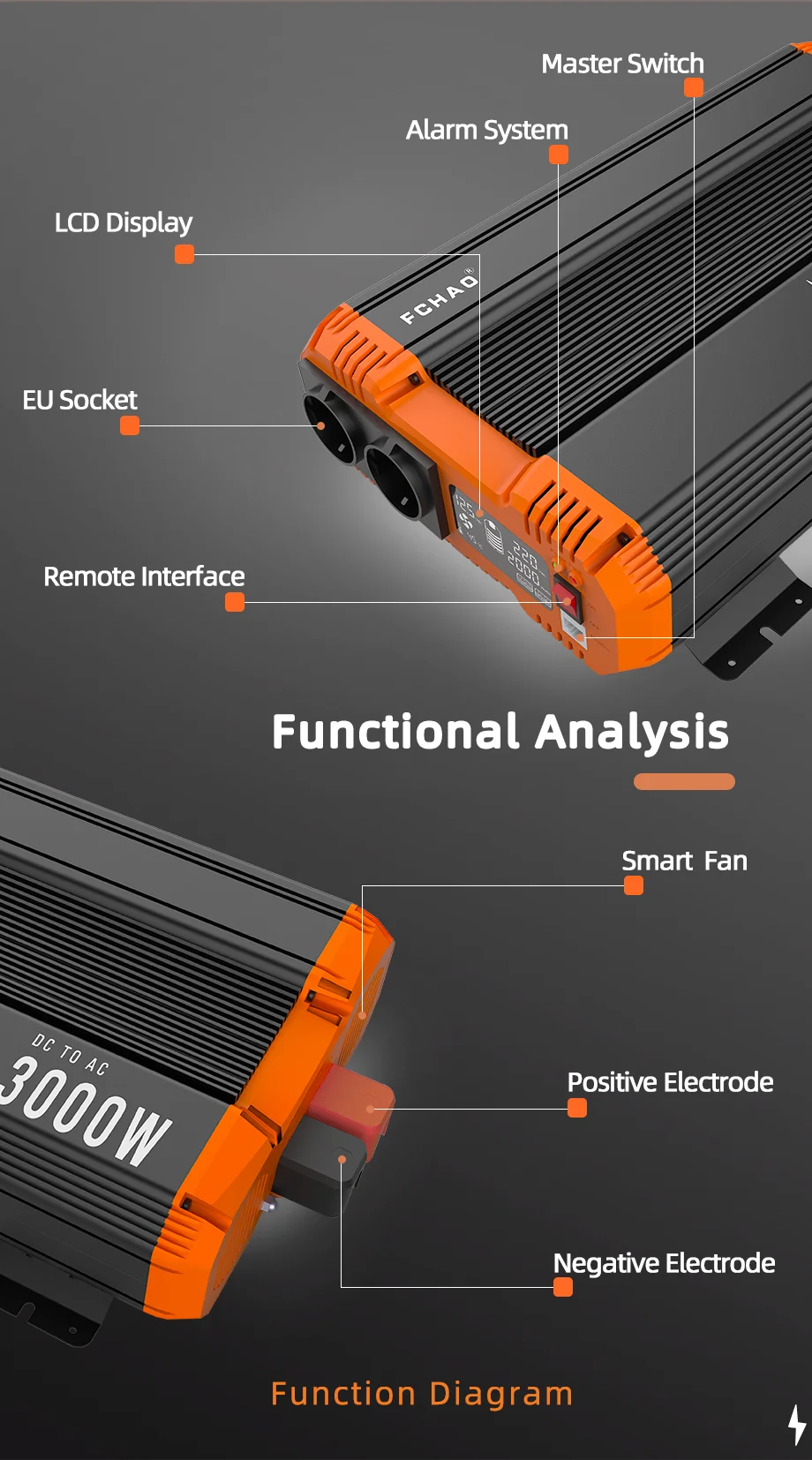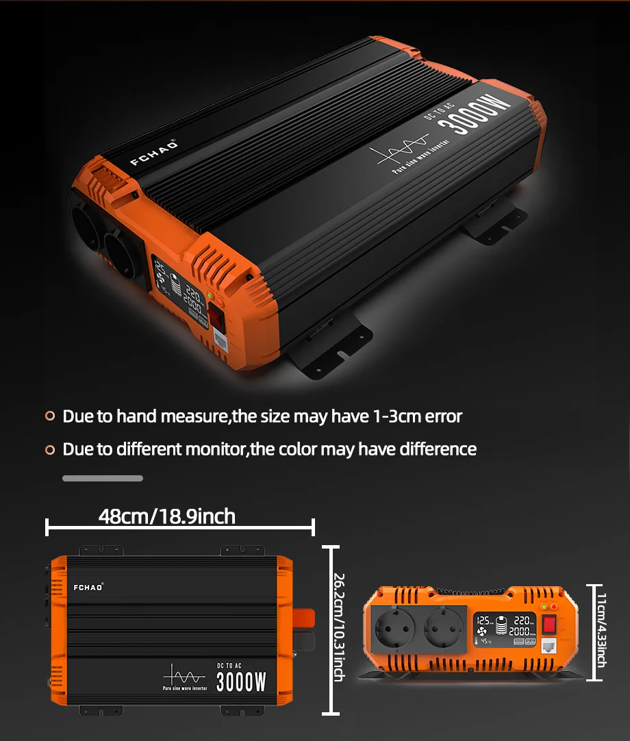 FCHAO Pure Sine Wave Inverter 12V to 230V, 3000W Continuous Power, Remote Controller, EU Socket, 50Hz, for Home and RVs