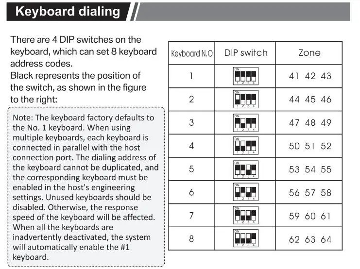 1. Can be divided into 4 independent areas, with 32 wireless zones, 8 wired zones, 56 expansion zones can be expanded by bus port (including 24 keyboard expansion zones and 32 bus zones), 32 single-bus zones, total support 128 zones.