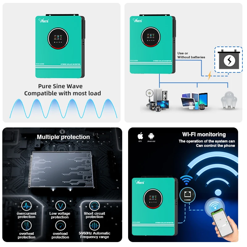Hybrid Solar Inverter 10.2KW 6.2KW 4.2KW 3KW Off Grid Pure Sine Wave Inverter 48V 24V 12V 230VAC with MPPT 160A 120A 80A Charger