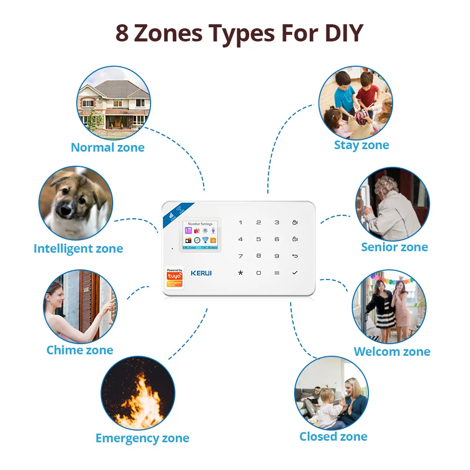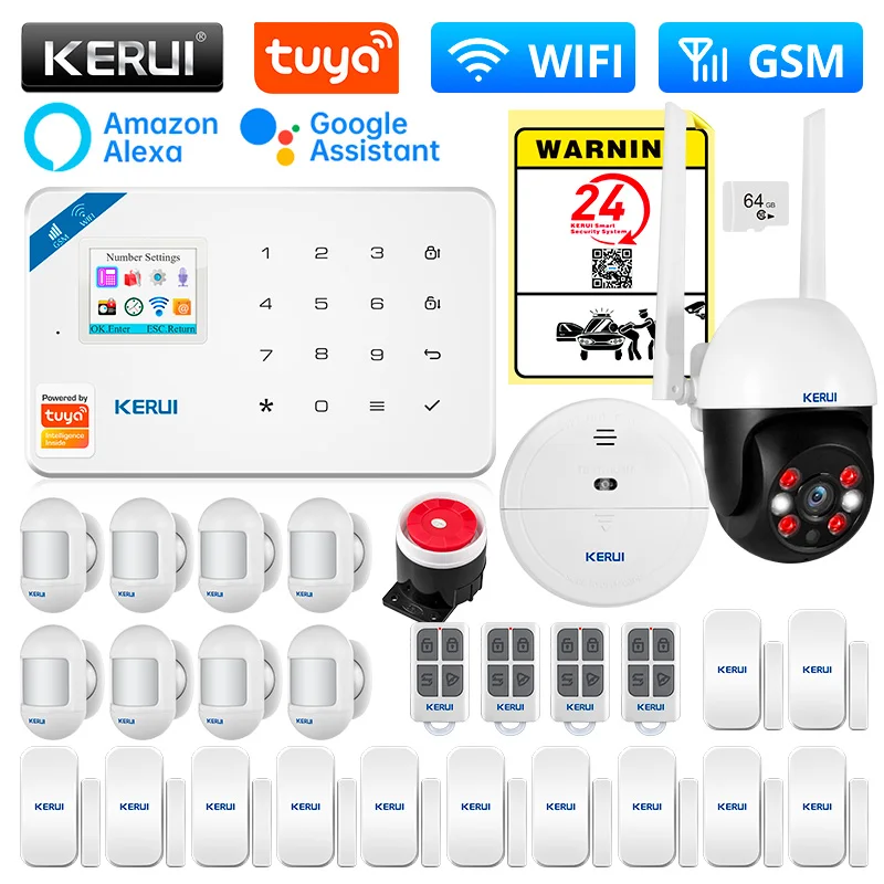 1. Put whole-home security at your fingertips with KERUI Alarm2. Receive mobile notifications when your system is triggered, change your Alarm modes, and monitor all your KERUI devices all through the Tuya Smart app3. Work With Alexa/Google Home4. Easily setup your KERUI Alarm by plugging in your base station, connecting to wifi via the Tuya Smart app, and placing your sensors in their ideal locations5. Tuya IP Camera can be linked to KERUI W181 Alarm System