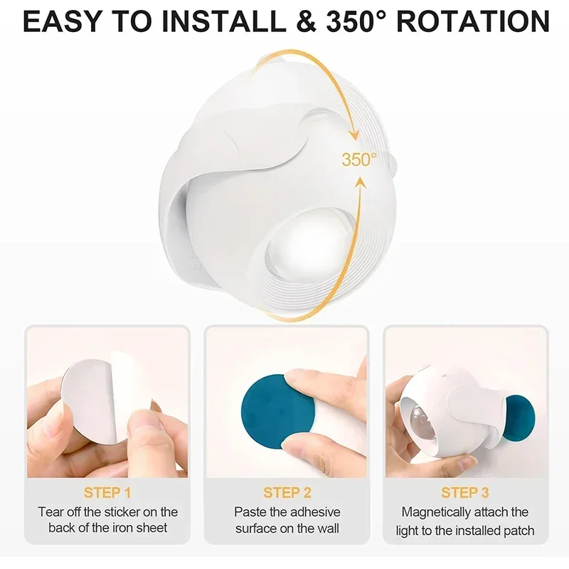【Easy to Install and 350° Rotatable】No drilling to destroy walls, no professor skills required, just peel 3M line and stick the ball wall lights, instantly illuminate any shadowy corner of your home. The rotatable cordless wall lights are like projectors with adjustable orientation, they can illuminate different angles of the room at your will.