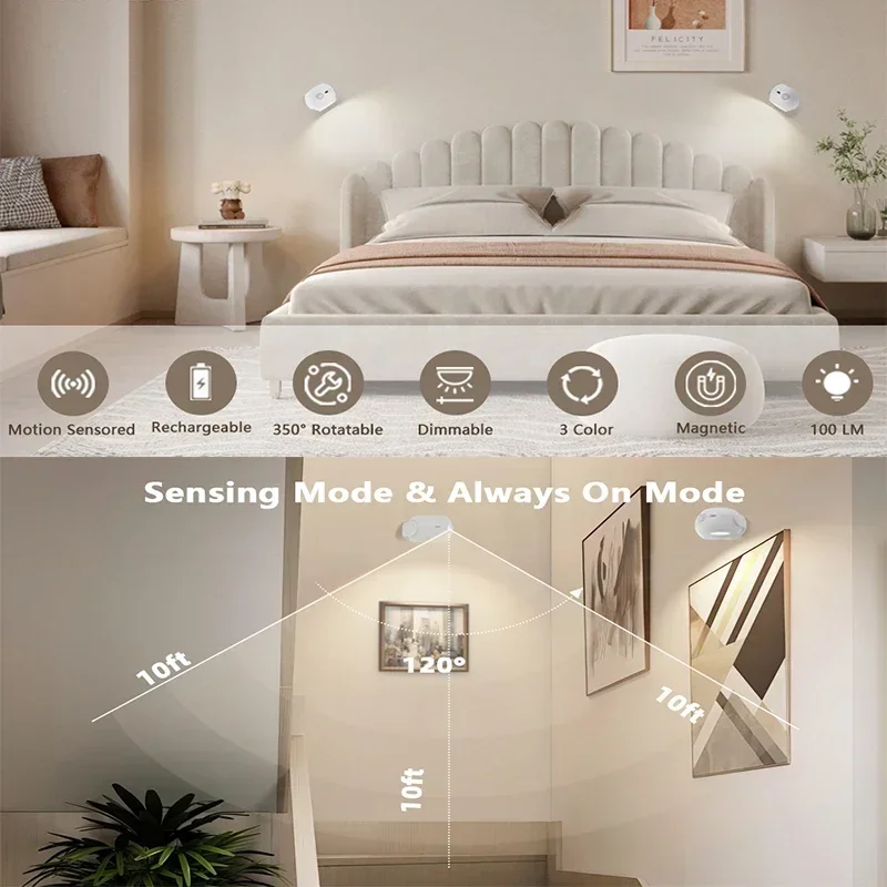 【Motion Sensored Wall Light】You can set the wall lights into Sensing Mode or Always On Mode. At sensing mode: the wall light auto-up when body movement is detected within 10ft in a dark environment and auto-off 20 seconds after detected the last movement. When you or pets pass hallway or entryway, the night lights can auto-illuminate room, save you from stepping objects, free your hands and help reduce use of high power lights at night and spend less on your energy bill.