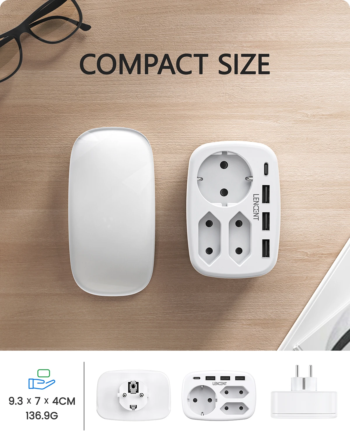 LENCENT EU Plug Multiple Wall Socket Extender with 3 AC Outlets 3 USB Ports and 1 Type C7-in-1 Plug Adapter for Home and Office