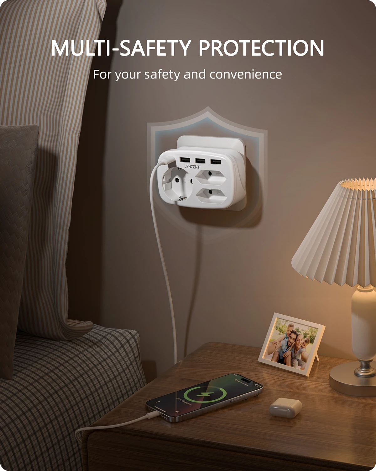 Plugs equipped with built-in protections protect your devices against excessive currents, overheating, short circuits, overloads, and CHILD PROTECTION; and flame retardant shell provide complete protection.