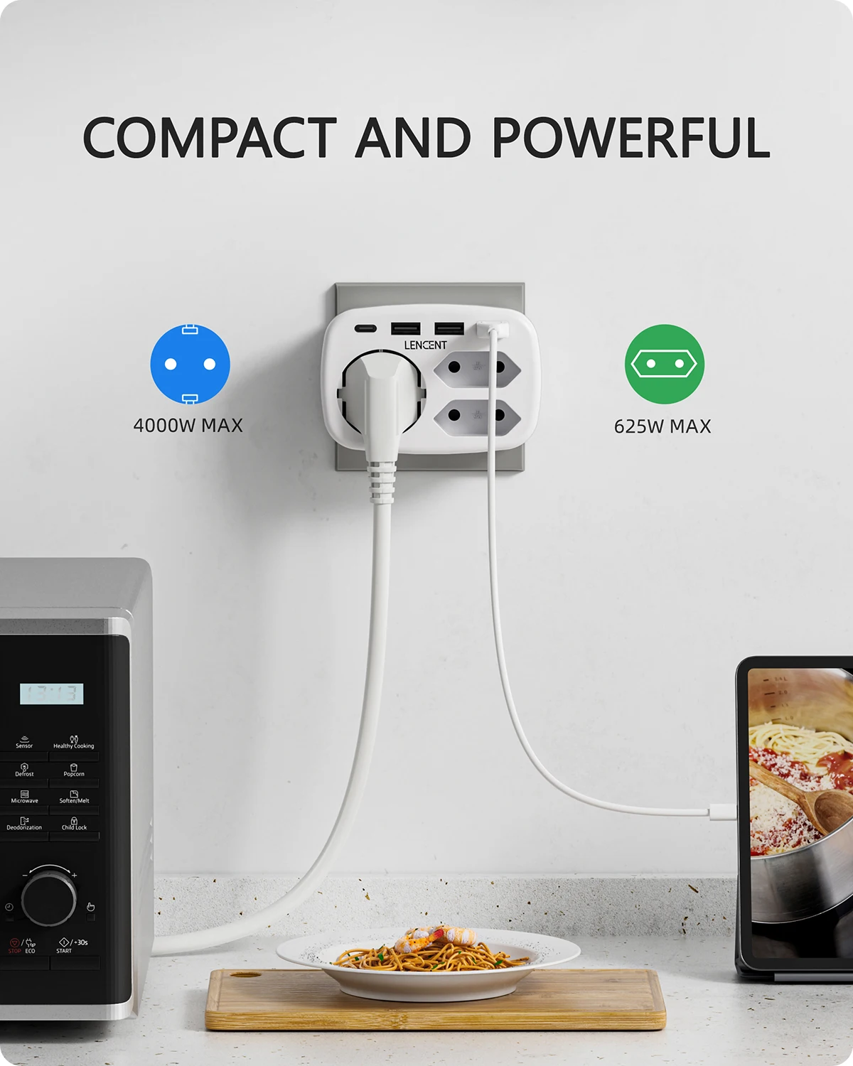 With a maximum power of up to 4000 watts (max. 250V, 16A). USB plug charging technology enables each USB port to detect and deliver an ideal input current of up to 2.4A