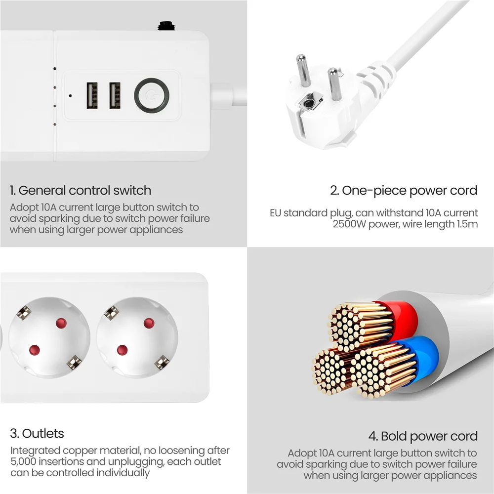 4. 4 AC Outlets + 2 USB Ports:Equipped with 4 smart plugs and 2 USB charging ports with 5ft long power cord,it provides a convenient power supply for home appliances such as fan, electric pot,light, holiday decorating lights,best idea for home office and professional workstations.