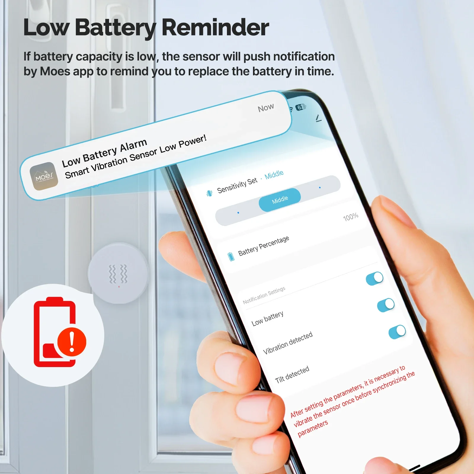 If battery capacity is low, the sensor will push notification by Moes app to remind you to replace the battery in time.