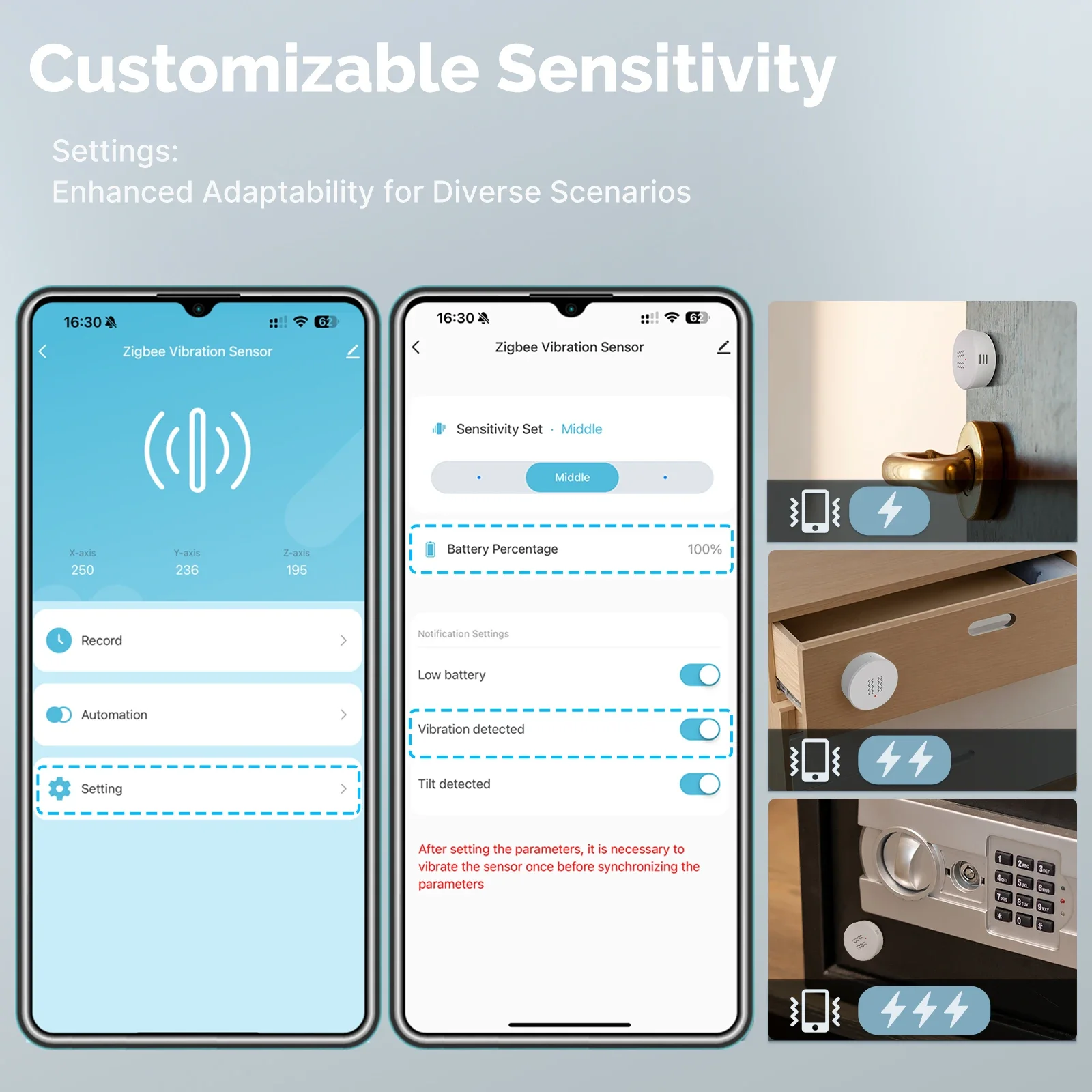 Link the sensor to the smart alarm. If the safe detects vibration or tilting, the alarm triggers, safeguarding your valuables.
