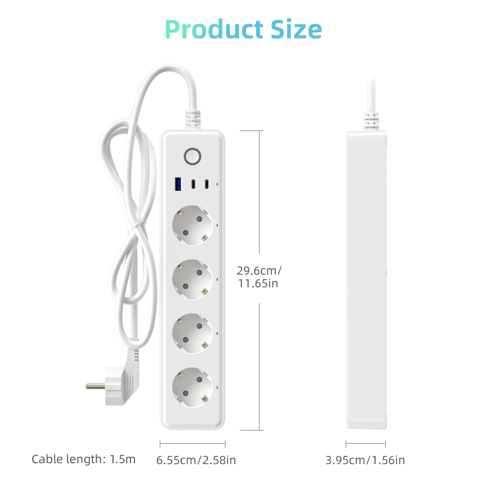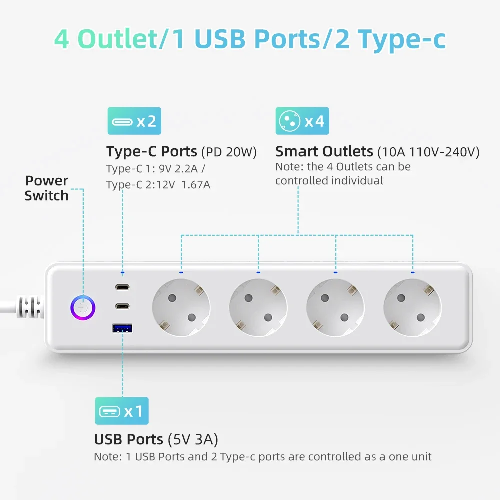 Multi-Functional Ports: 4 smart sockets, 1 USB, 2 Type-C to meet various charging needs.