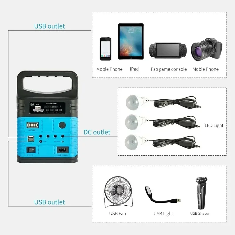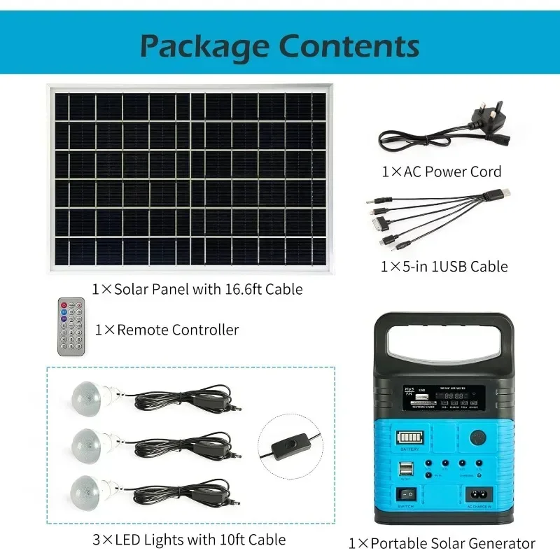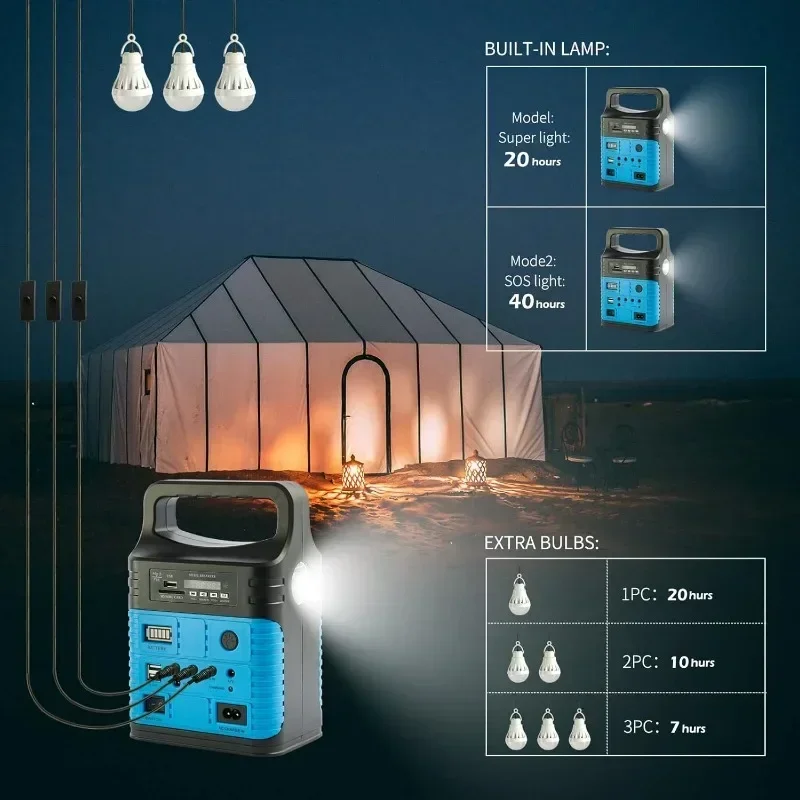 Portable Solar Generator Kit: A rechargeable battery solar generator system with solar panels, storage solar generator power to battery and supply power to LED light and mobile phone. Widely applicable to home, camping, rv.