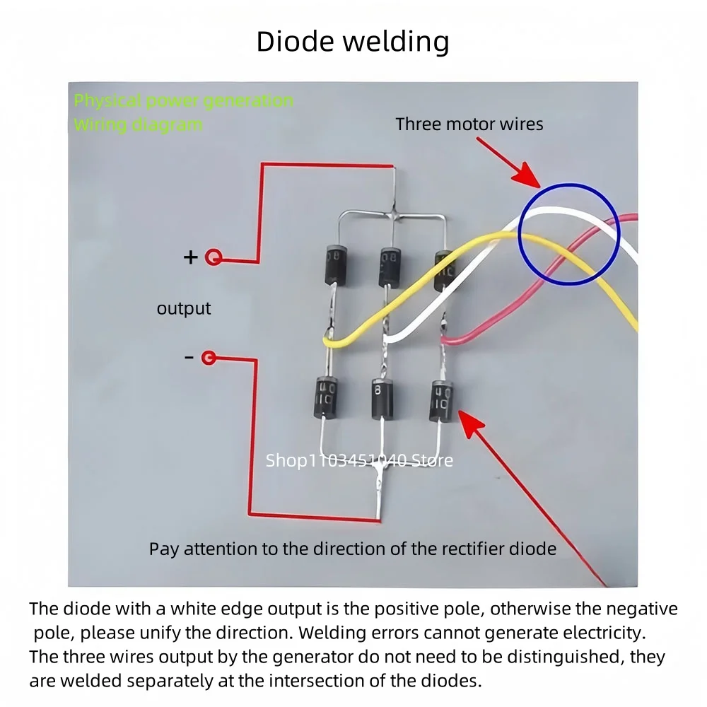 Adopting a three-phase permanent magnet synchronous generator without carbon brushes, it generates three-phase AC power with three wires at the bottom. It requires a self-contained electric magnet to weld six rectifier diodes and convert them into DC power generation.