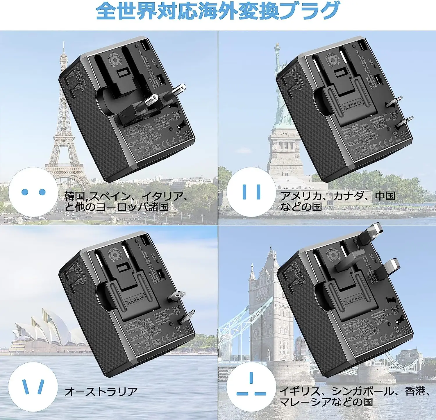 The shape of the outlet can be changed to fit A-type, O-type, C type and BF-type outlets. This International Conversion Brag is compatible with plugs in 150 countries including Korea, Europa, UK, USA, Australia, and Hong Kong