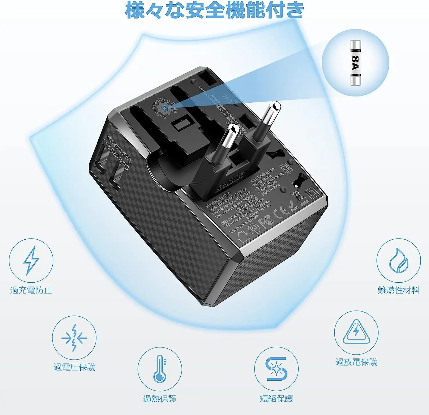 The power conversion plug includes one 8A fuse. Overcharging, overheating protection, short circuit, overdischarge, overload, overpressure, overcurrent, etc. Please note that this conversion bra does not have a transformer function. Please pay attention to the voltage of the device connected before use