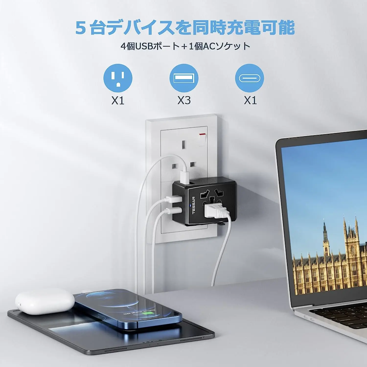 There are 3 USB-A ports and USB-C ports. The maximum output of a single USB-A port is 5V 2.4A, and the maximum output of the USB-C port is 5V 3.0A, so the 4 USB ports are 5V 3.5A. This multi-conversion plug is suitable for various digital products such as smartphones and tablets