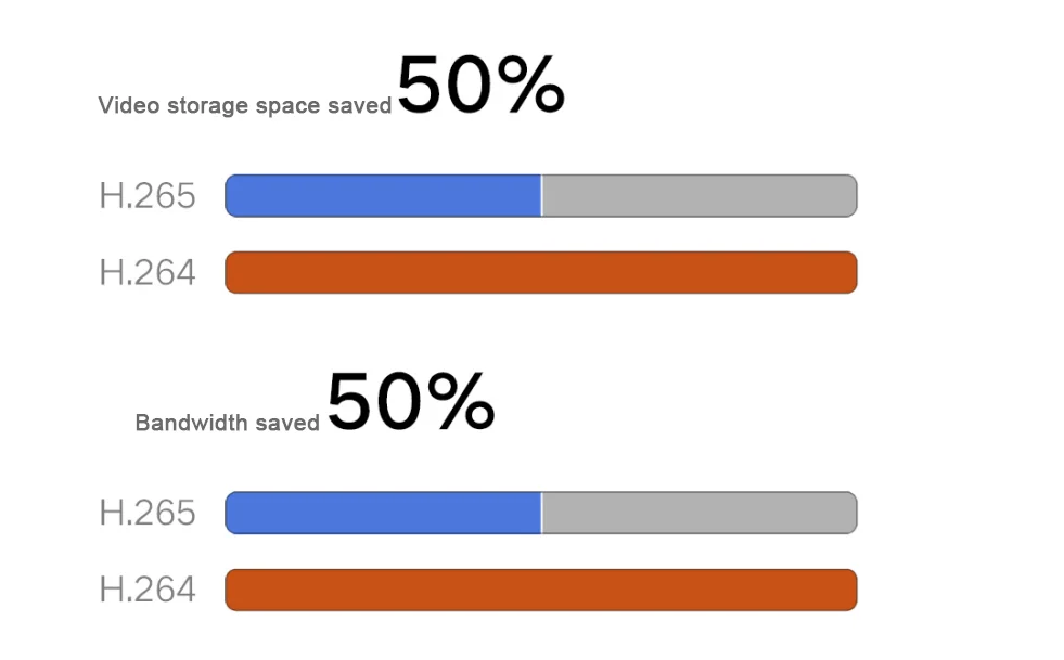 Save storage space and bandwidth for smooth video play. Uses 50% less bandwidth and storage space.