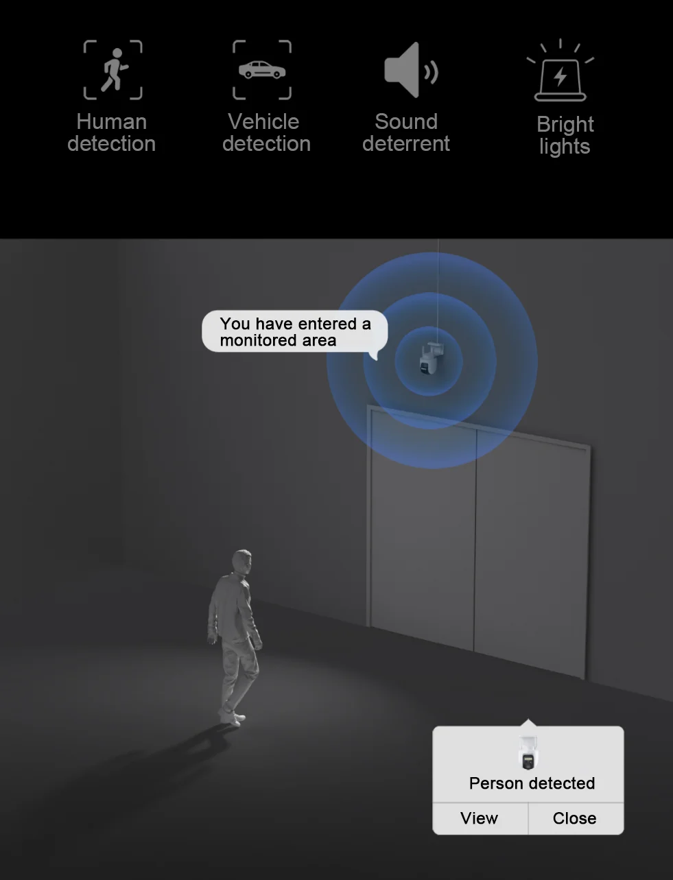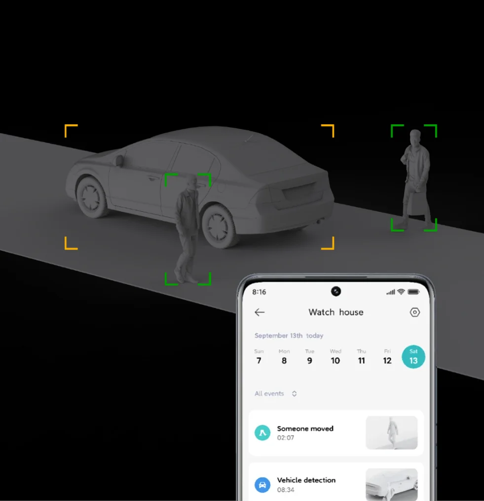Human and vehicle detection with local algorithms to filter out false alarms. When a person or vehicle is detected, an alarm video is automatically recorded and a notification is sent to your smartphone.