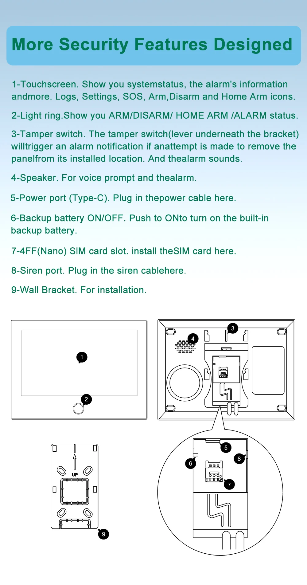 2. DC 12V/1A port and 8 Wired Sensors suitable for families with pre-installed embedded lines.